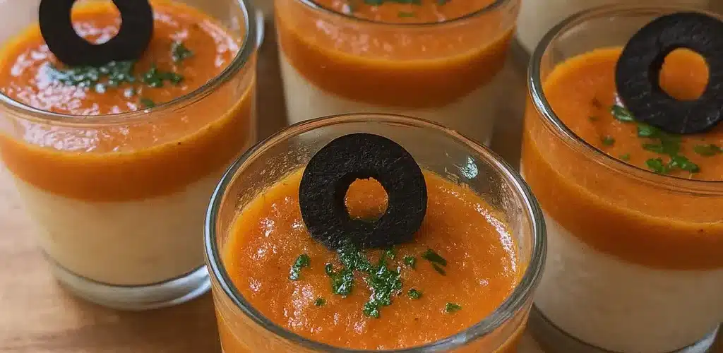 - Cuando la crema de pimientos esté templada, verterla con cuidado sobre la capa de brandada para que se vean las dos capas diferenciadas.